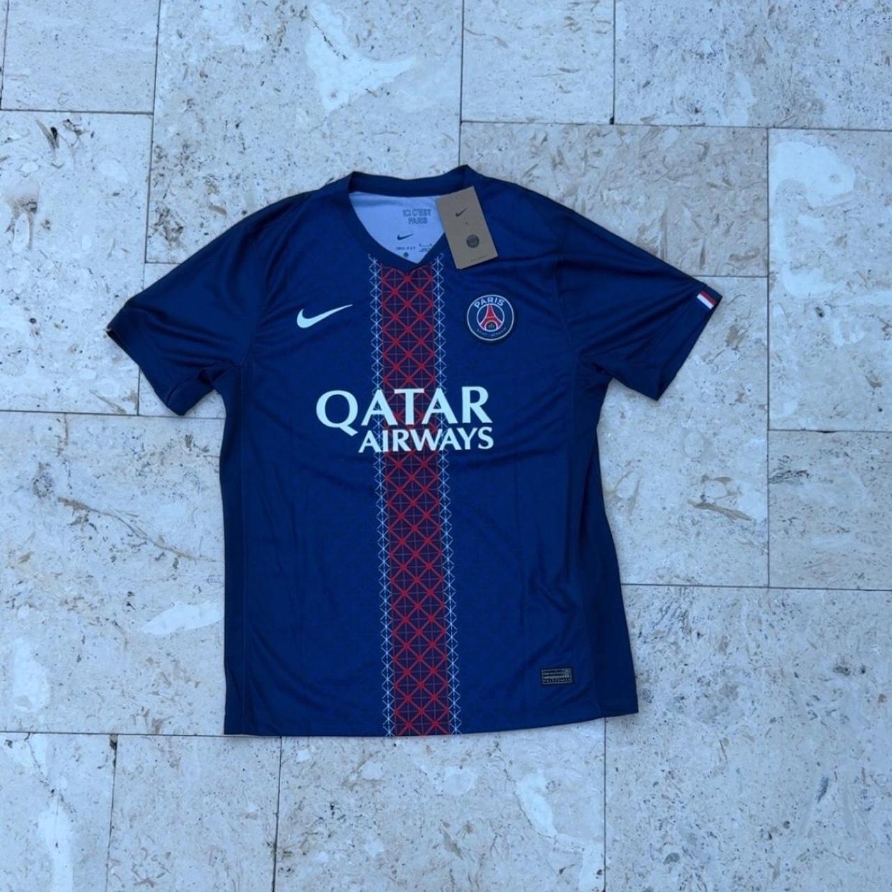 Navy football jersey, central red stripe, club crest, printed number, sporty design, authentic kit.
