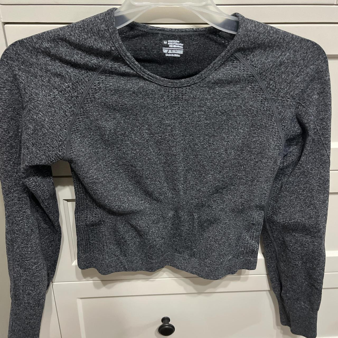 Grey long sleeve workout top heather grey, seamless, marl knit, sporty fit, athletic, breathable fabric, crop length, minimalistic.